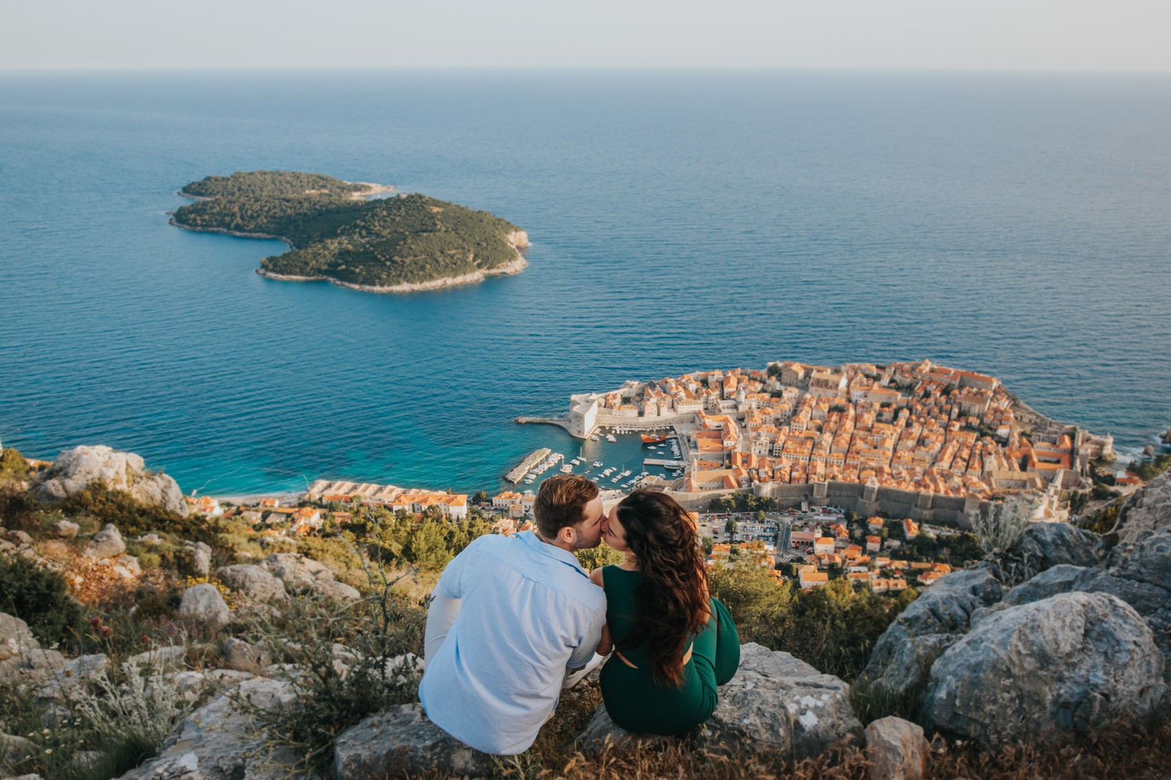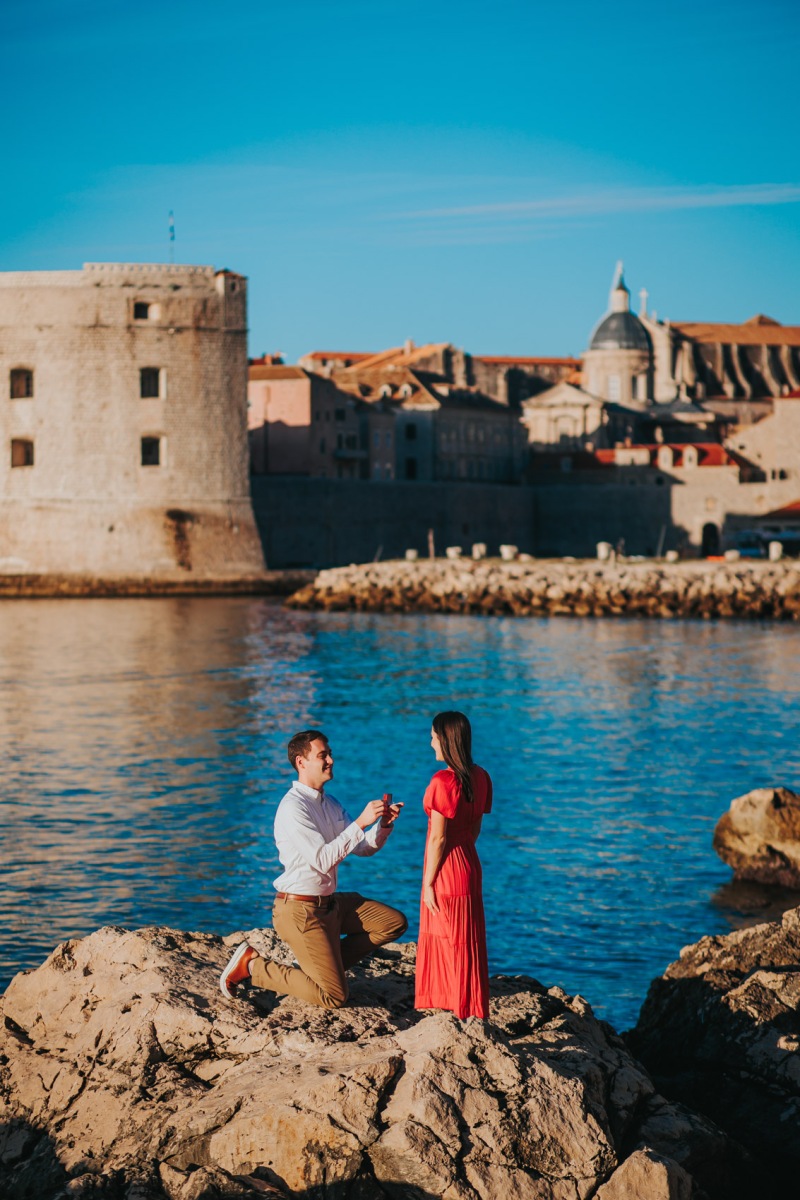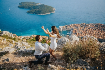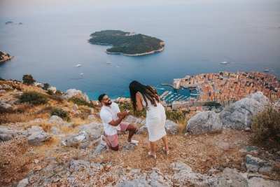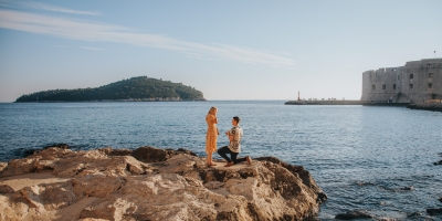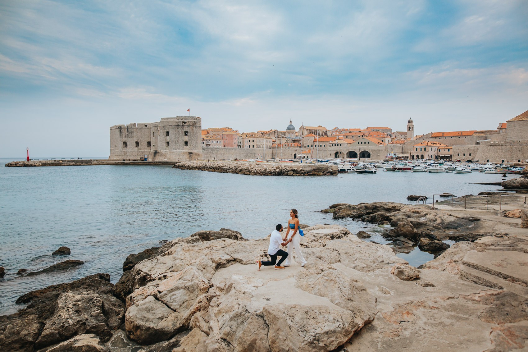 Komarda is my personal favorite place for proposals. It’s not 400m above Old town birds eye kind of photo, but still offers a nice sea level wide shot of the Old town port. Dubrovnik is packed with tourists during the summer, but thankfully Komarda is still a hidden gem, with a handful of locals swimming and sunbathing in the late afternoon. I never had privacy issues there, maybe a person or two can see you from a distance, but nothing like applauding and cheering kind of exposure. Kneeling is a brief moment and always goes unnoticed at this location.
